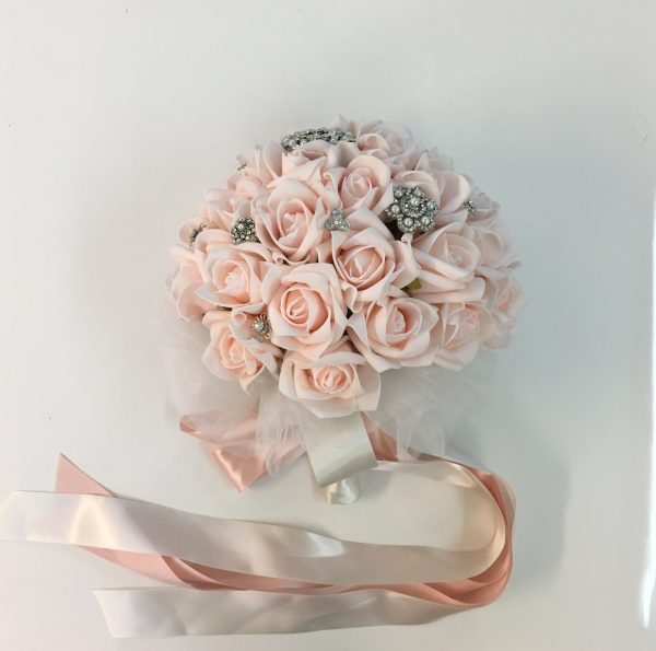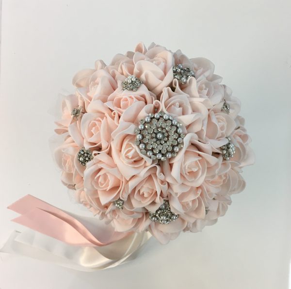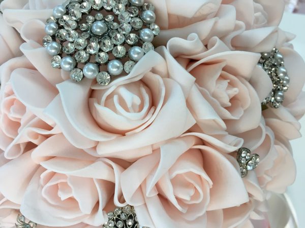 PUDRA RENGİ GÜLLER ARASINDA TAŞLI VE İNCİLİLERLE SÜSLEMMİŞTİR.