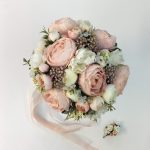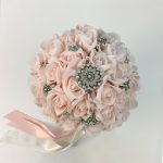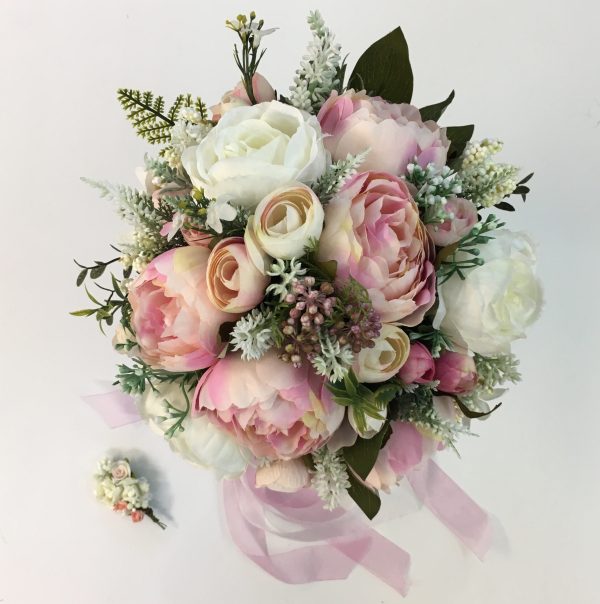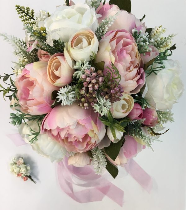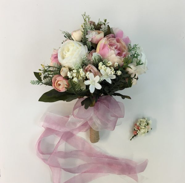 PEMBE ŞAKAYIKLI GELİN EL BUKETİ, DAMAT YAKA ÇİÇEGİ İLE BİRLİKTEDİR.